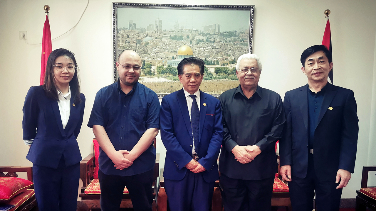 巴勒斯坦大使Fariz Mehdawi热情接待大会主席何绪明一行,双方就物联网未来发展交换意见,一致认为物联网将是重要的发展机遇,并就合作领域进行磋商,同意共同起草合作备忘录,落实参加国家展计划。